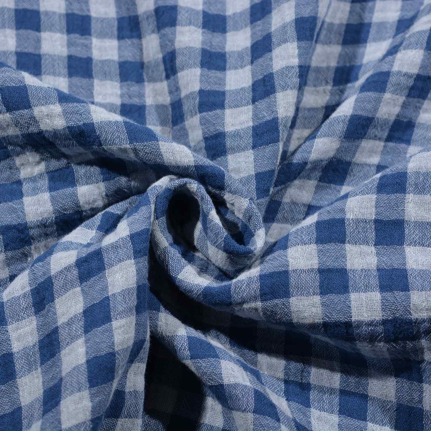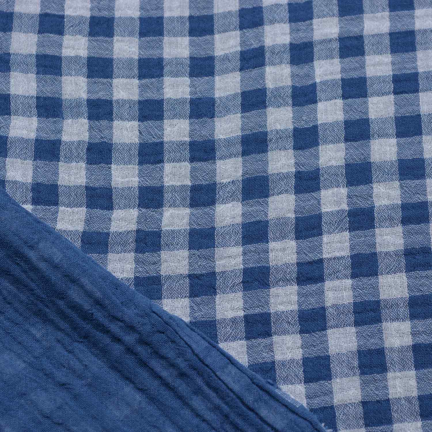 Bei diesem Stoff ist das weiß mit dunklem Indigoblau gemischt. Die untere Lage der Double Gauze ist ebenfalls in dunklem Indigoblau gefärbt.