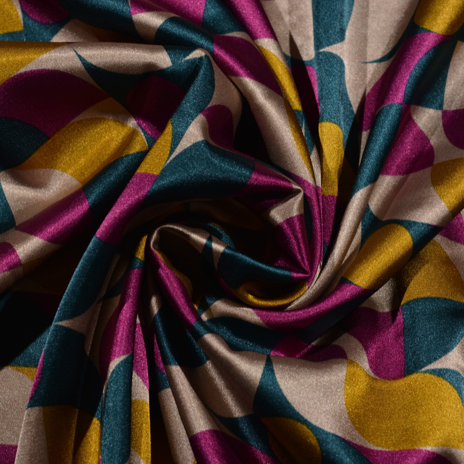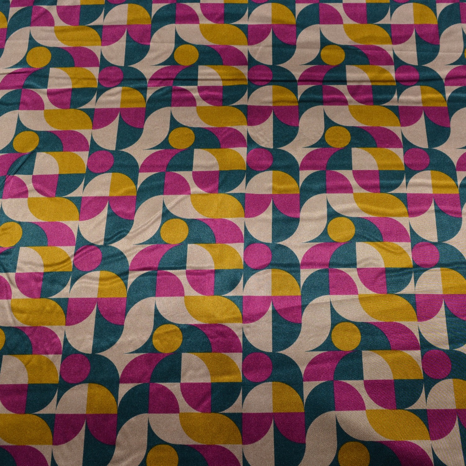Der Polyester-Satin „Retroa“ überzeugt mit einem auffälligen, geometrischen Retro-Design in kräftigem Pink, Senfgelb und Petrol auf hellem Grund. Der Stoff ist leicht, glänzend und geschmeidig – ideal für elegante Outfits oder stylische Deko-Projekte. Mit seinem fließenden Fall eignet er sich hervorragend für Blusen, Kleider, Tücher oder als Futterstoff.