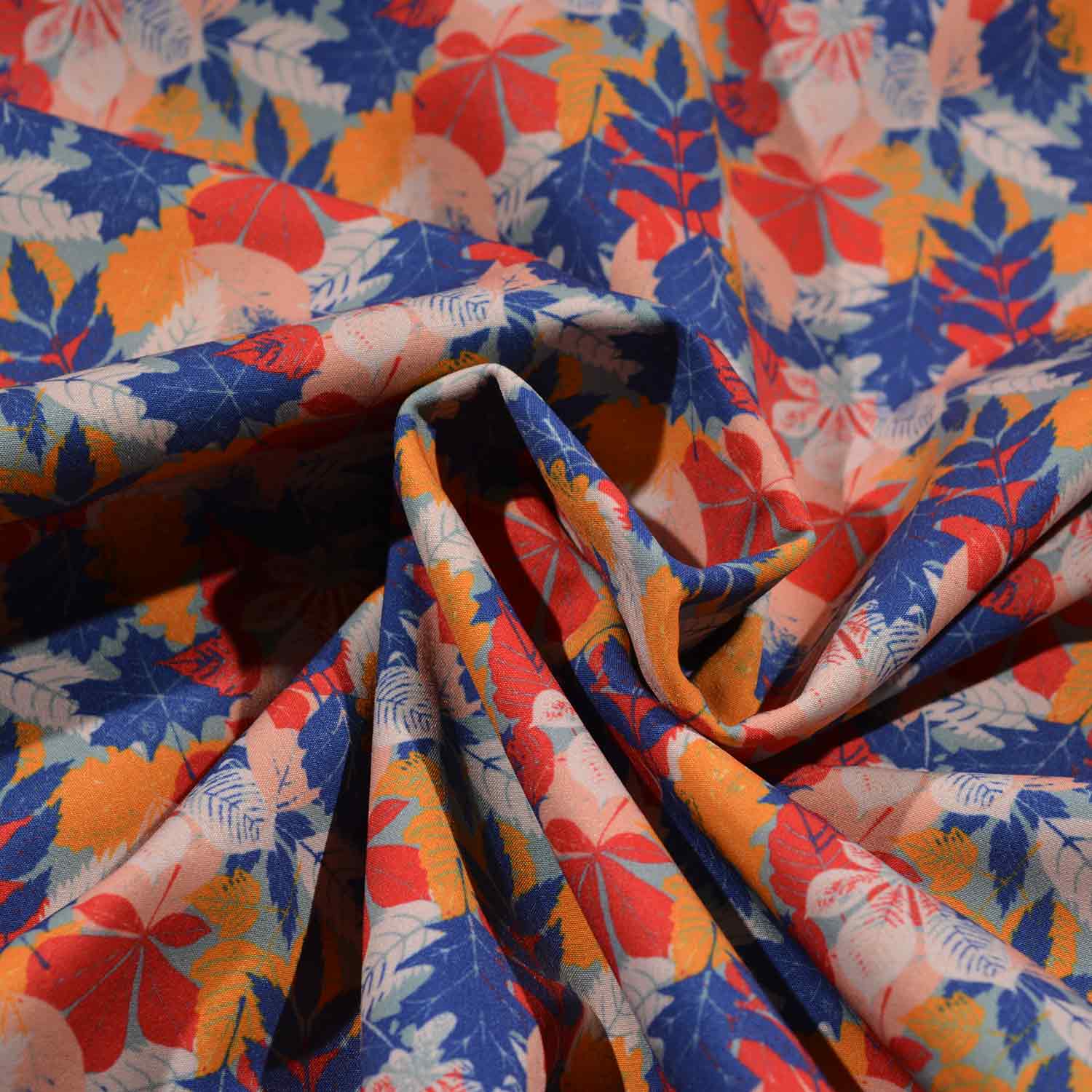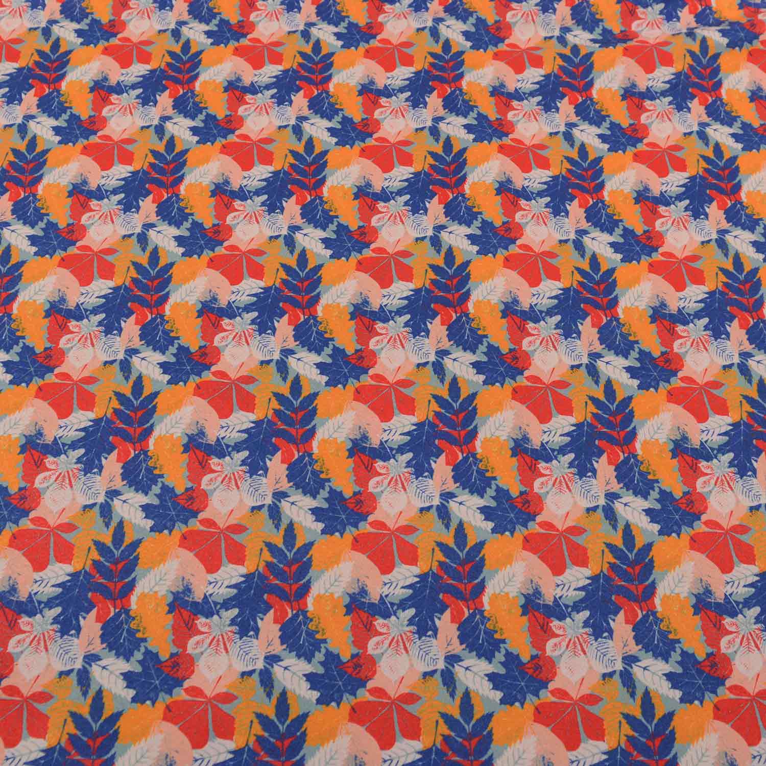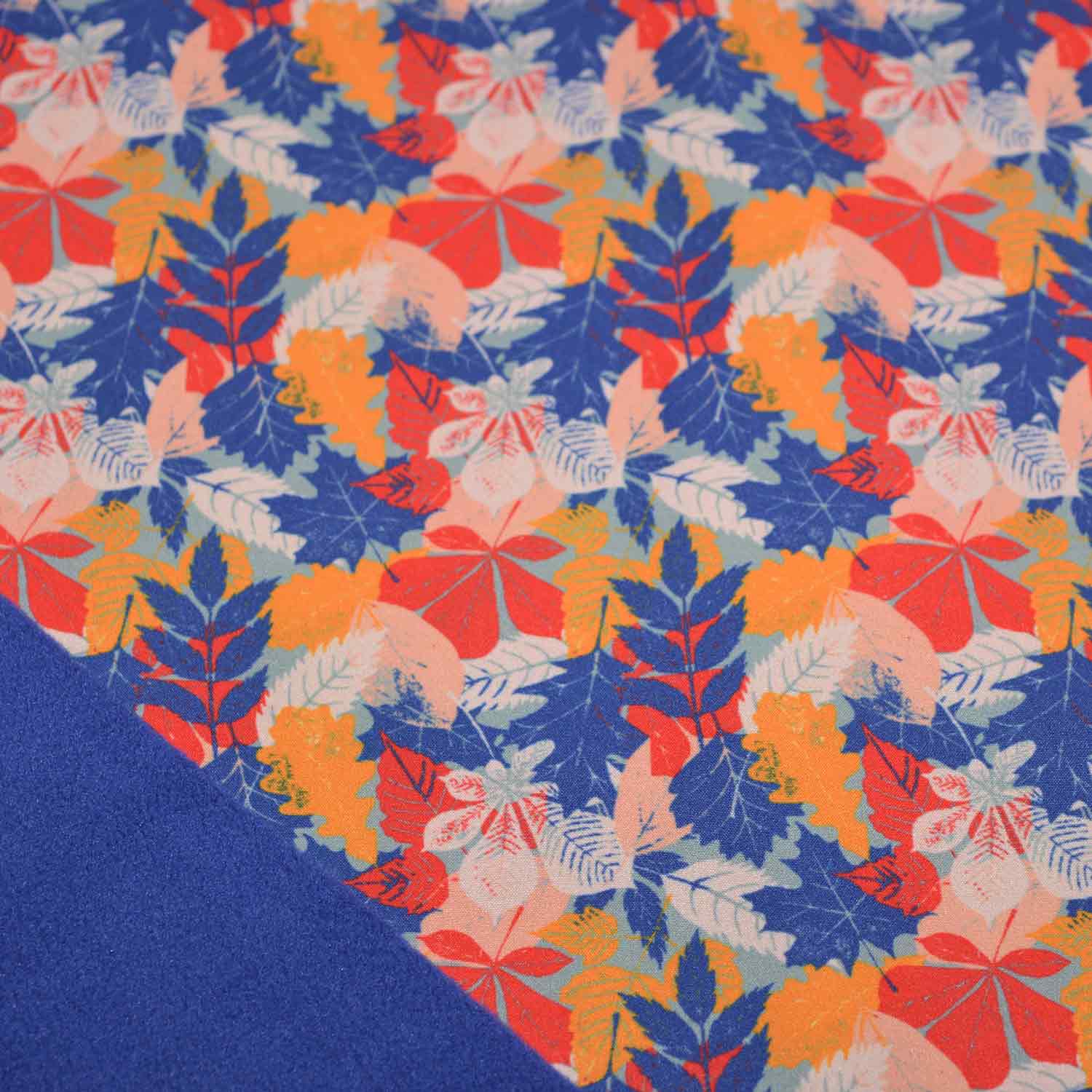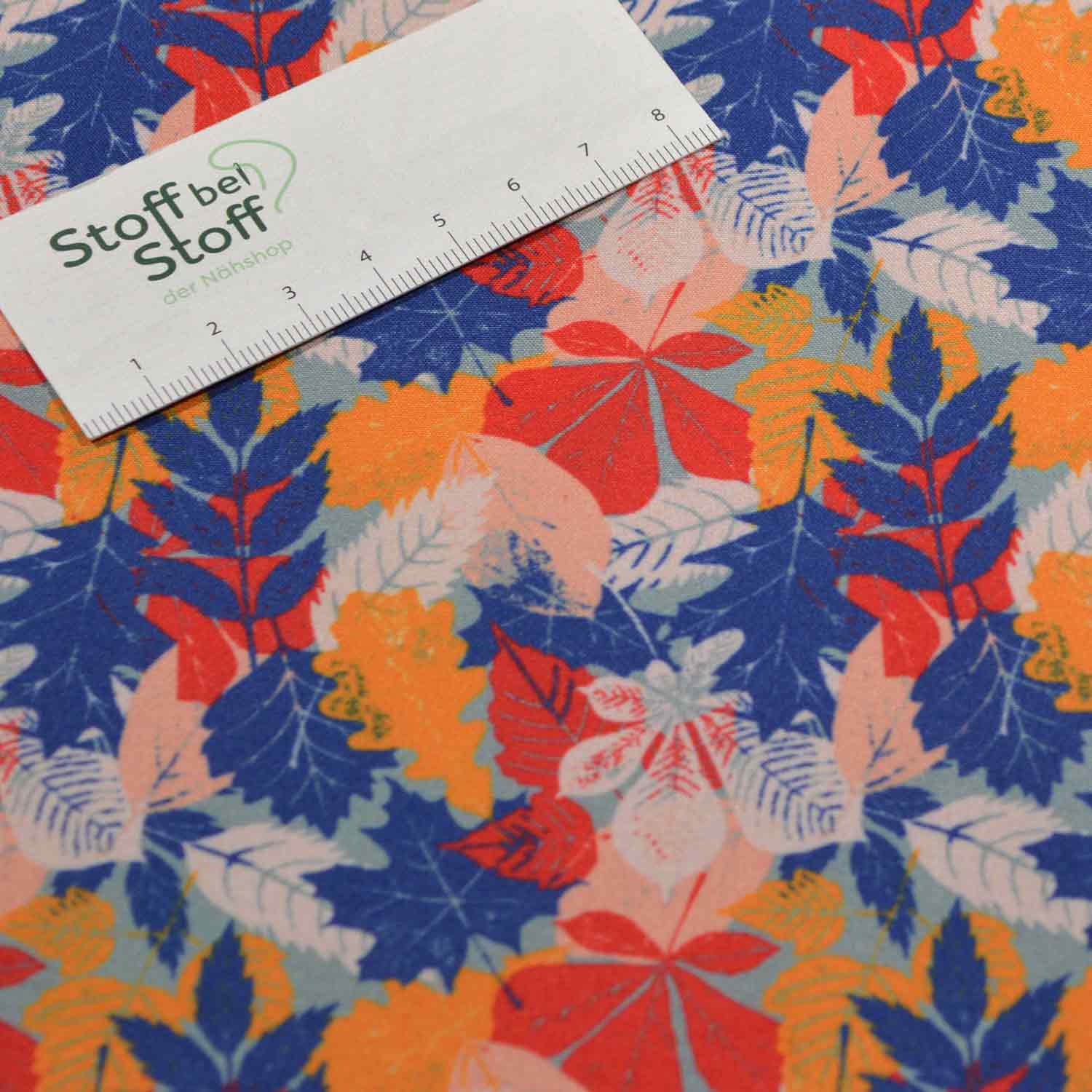 Auf dem stahlblauen Untergrund finden sich die Blätter von Kastanien, Ahorn, Ebereschen, Eichen und noch viele mehr. Übereinander liegend sind sie in den Farben, dunkelblau, rot, orange, hellgrau und rosa und ergeben ein überraschend harmonisches Bild.