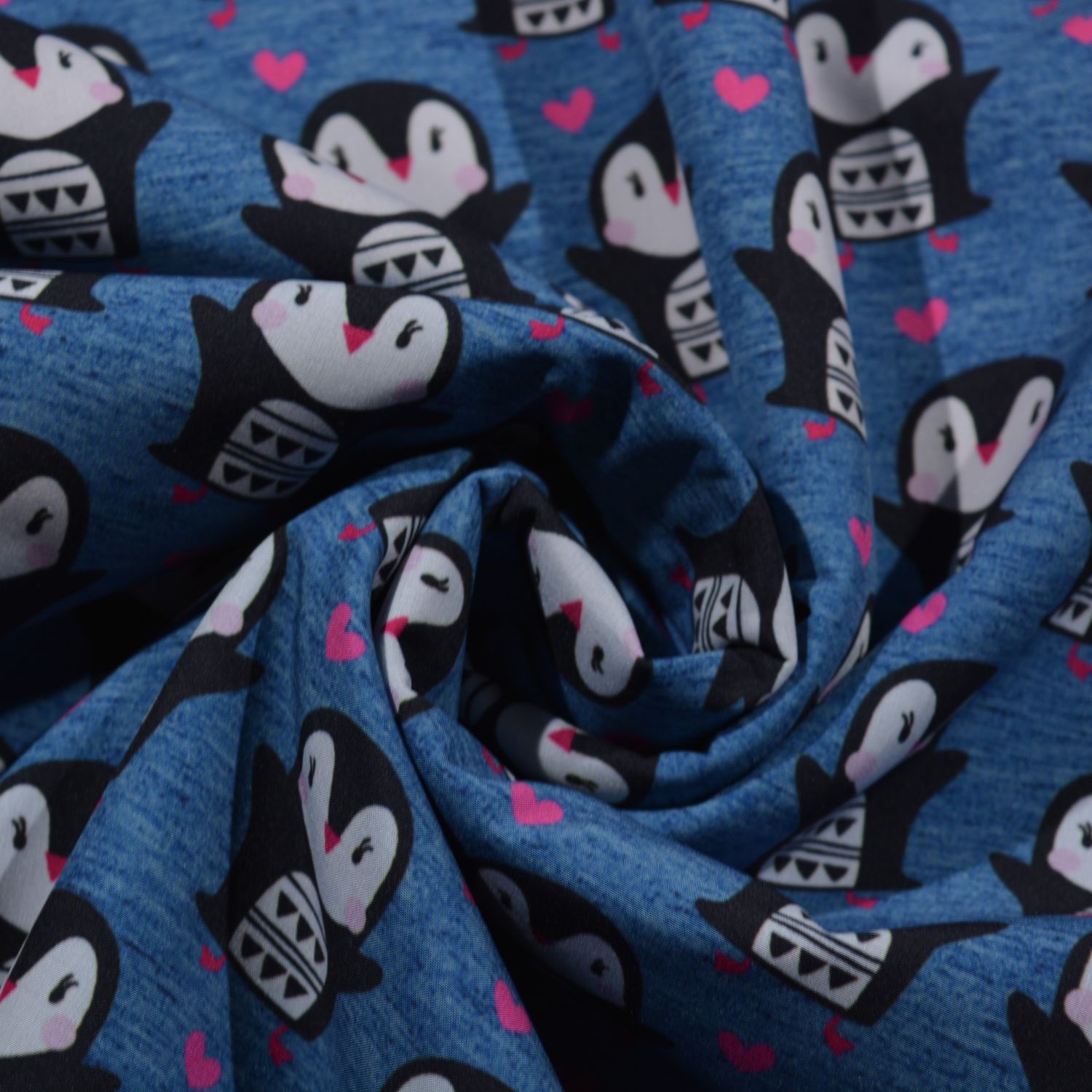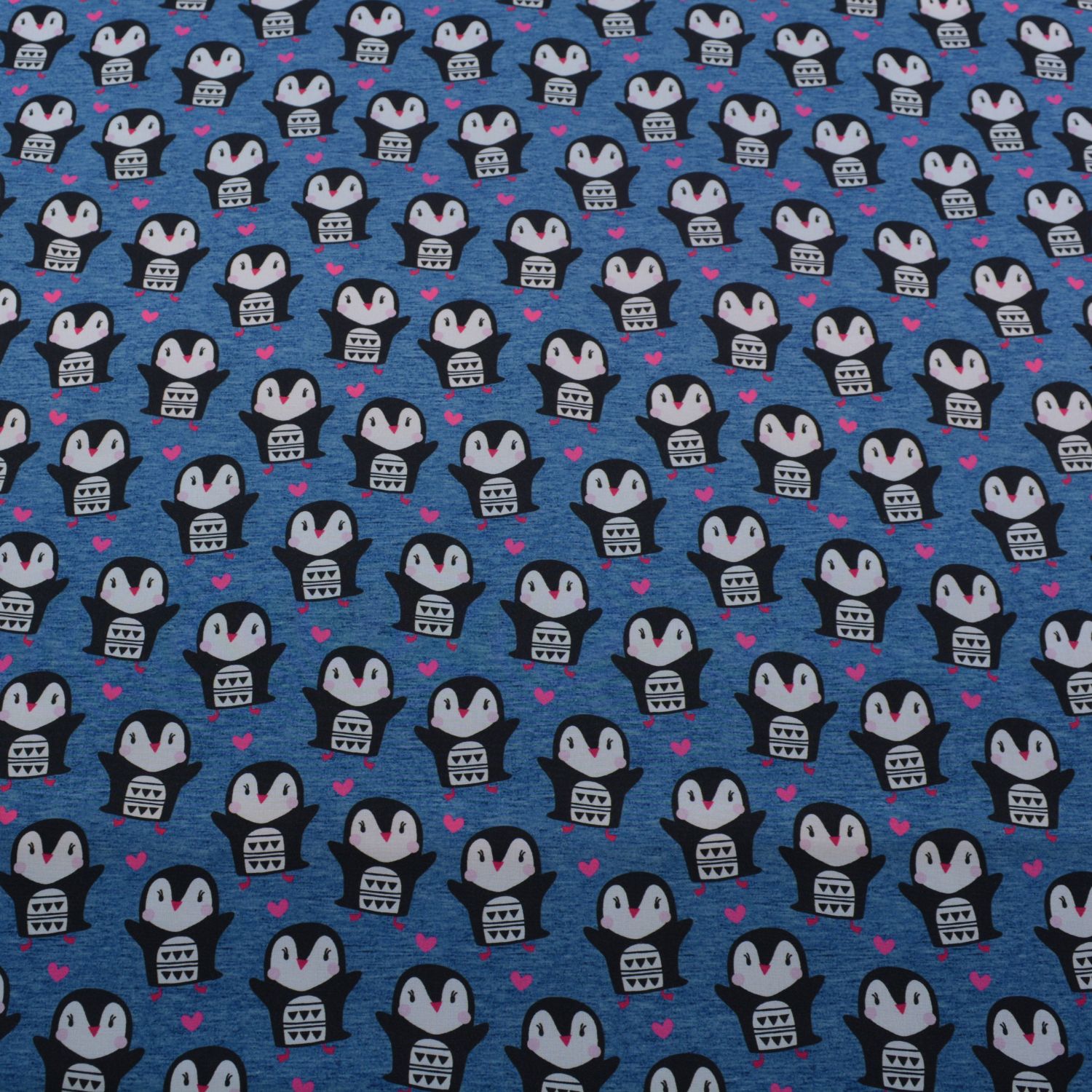 Dieser hochwertige Softshell-Stoff begeistert mit einem liebevollen Allover-Muster aus kleinen Pinguinen und Herzchen auf meliertem blauem Grund. Das verspielte Design macht den Stoff besonders attraktiv für Kinder- und Babybekleidung, ist aber ebenso ideal für fröhliche Outdoorprojekte.