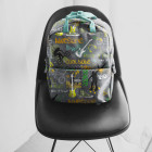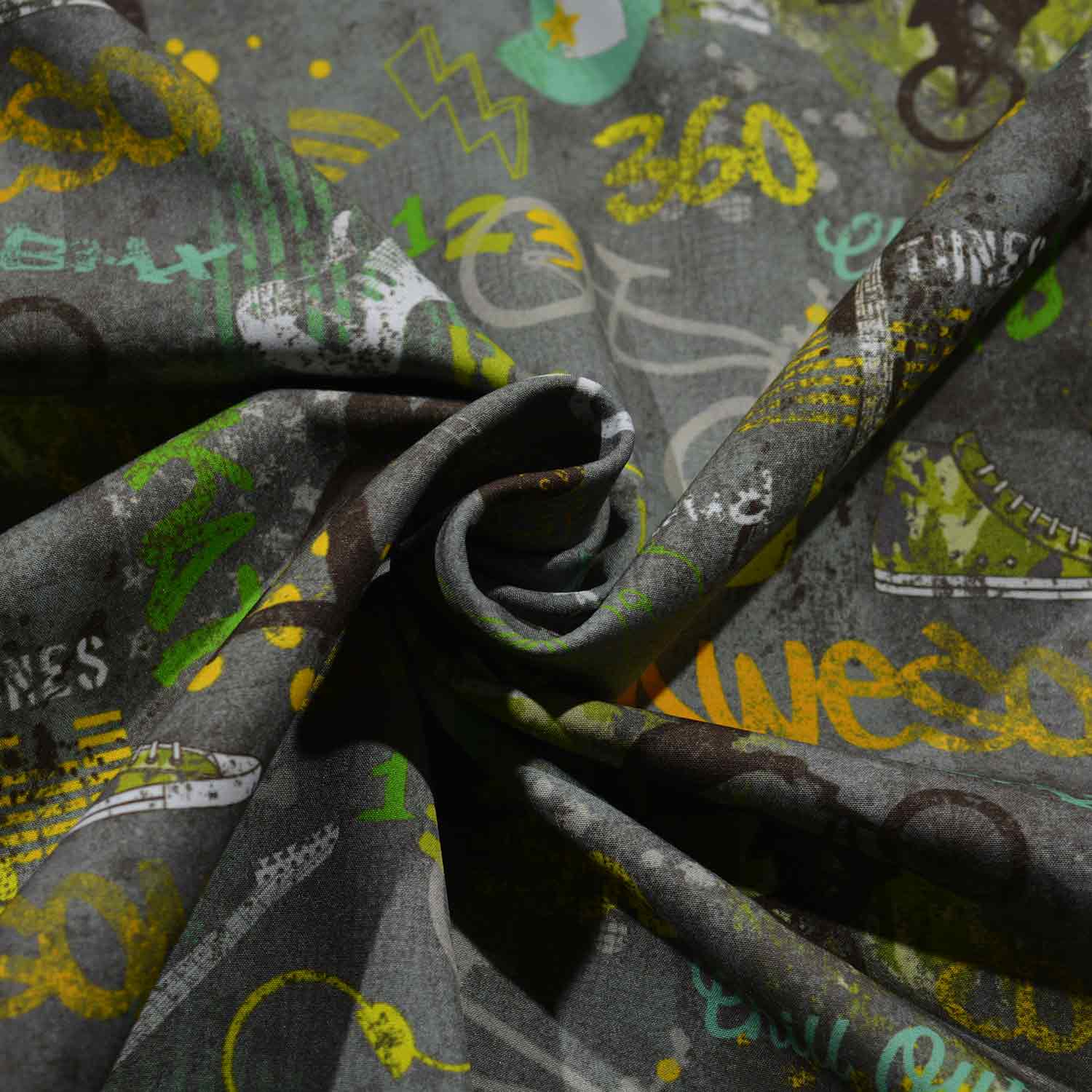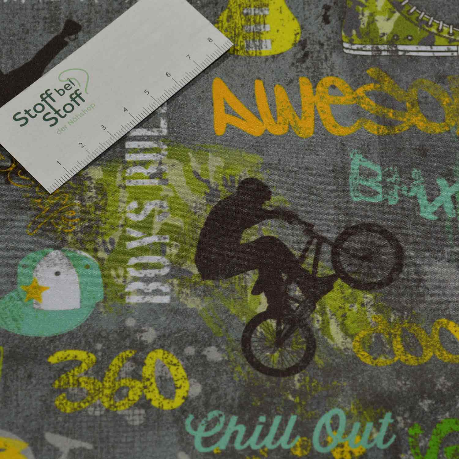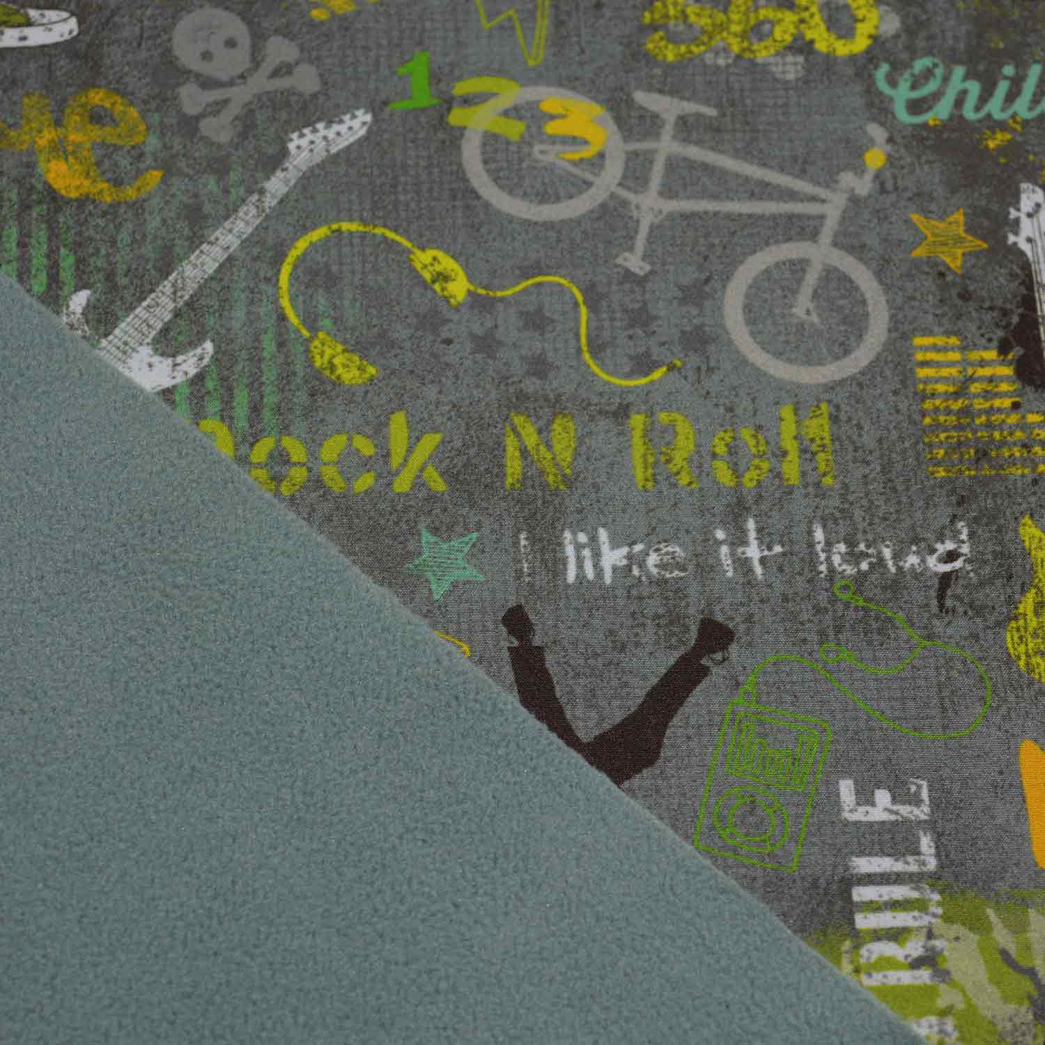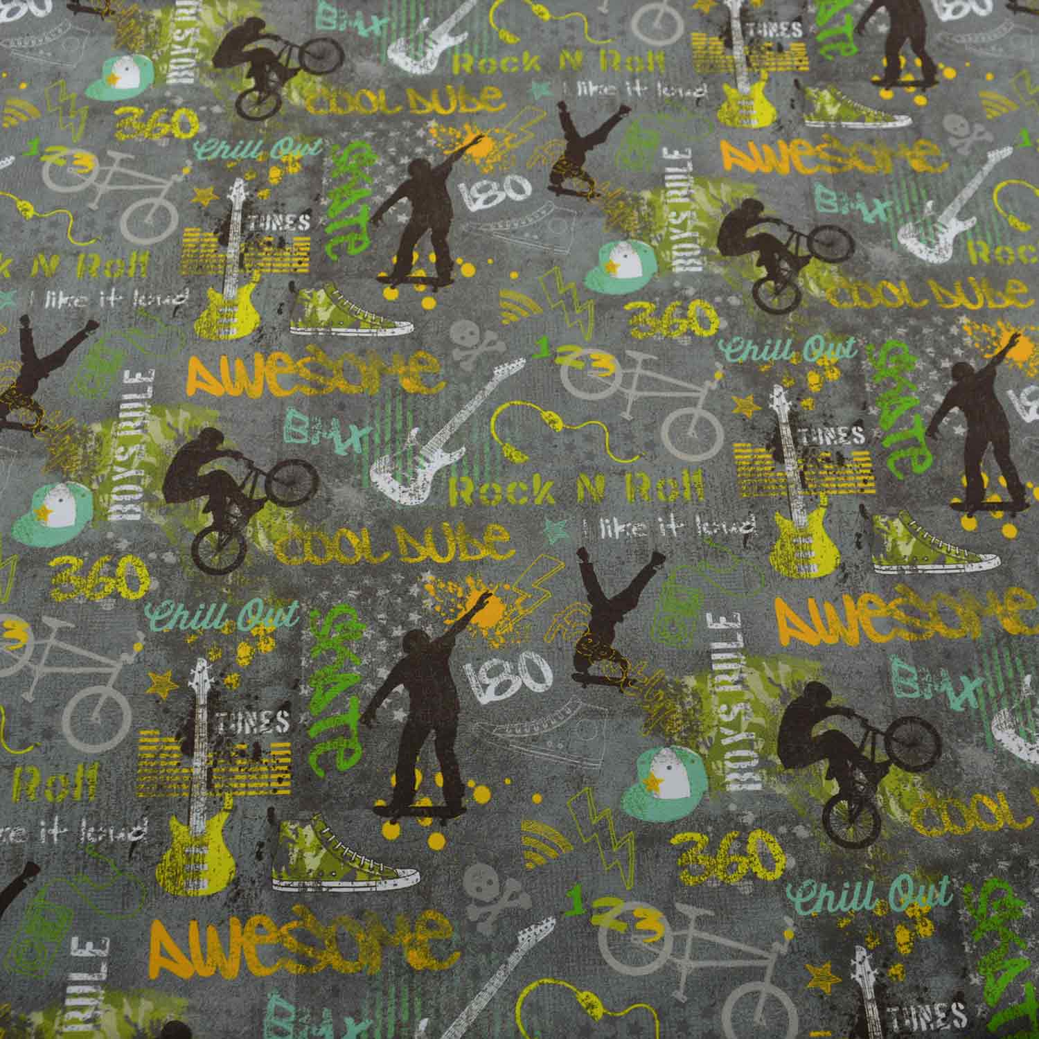 Der salbeigrüne Untergrund ist bedruckt mit verschiedenen Slogans und Graffitis, Converse-Turmschuhen, E-Gitarren und Silhouetten von Skatern und BMX-Fahrern in Grüntönen, weiß und apricot.