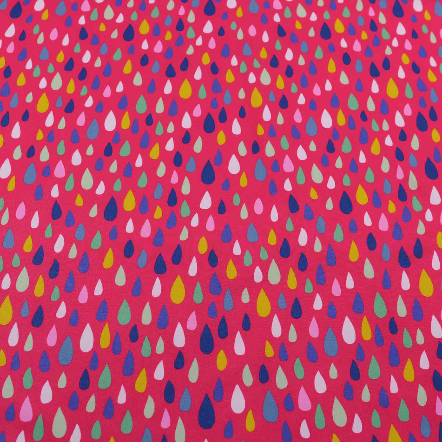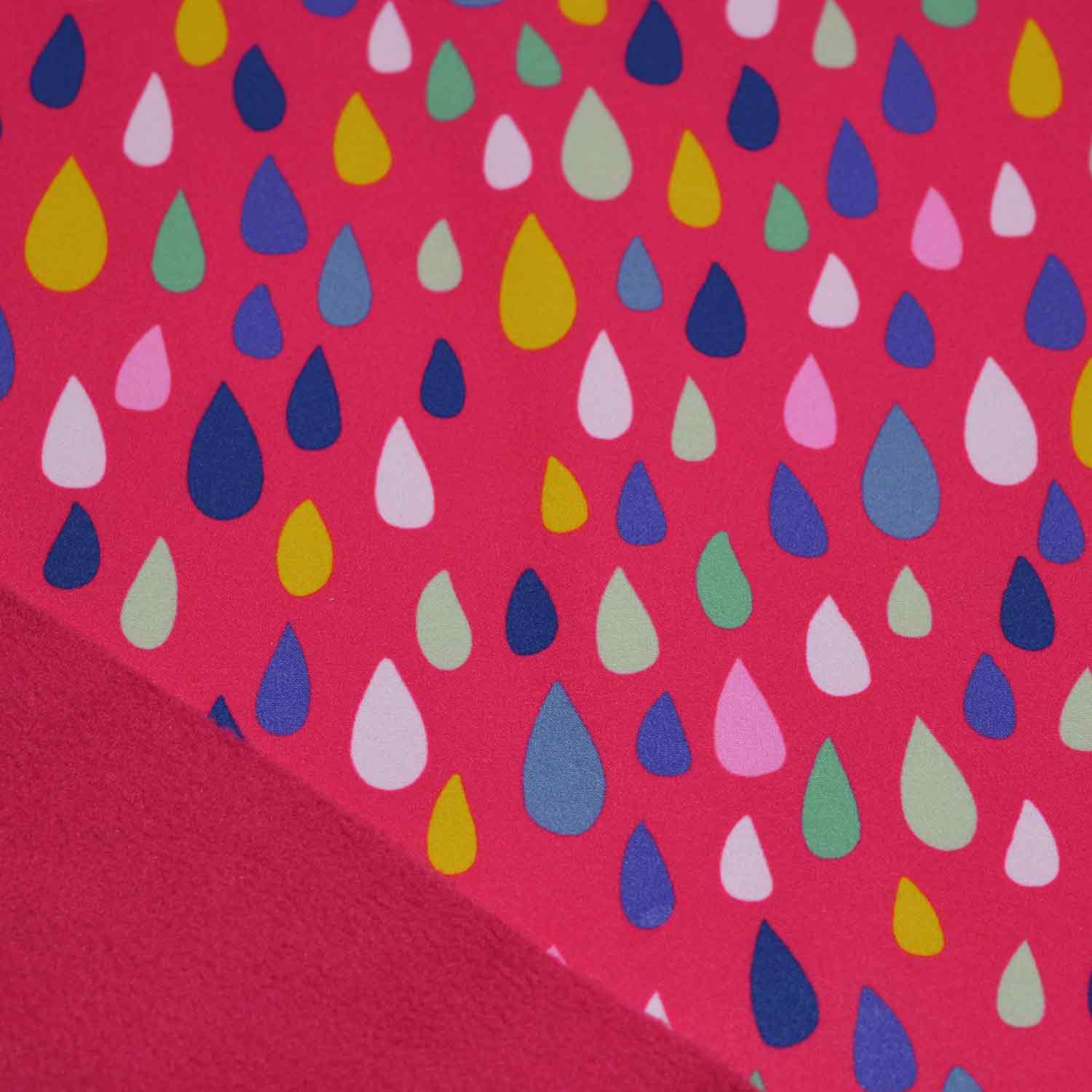 Auf den altrosa Untergrund dieses Softshells sind bunte Regentropfen und Sterne in verschiedenen Grüßen gedruckt.Die flauschige Abseite ist ebenfalls altrosa.