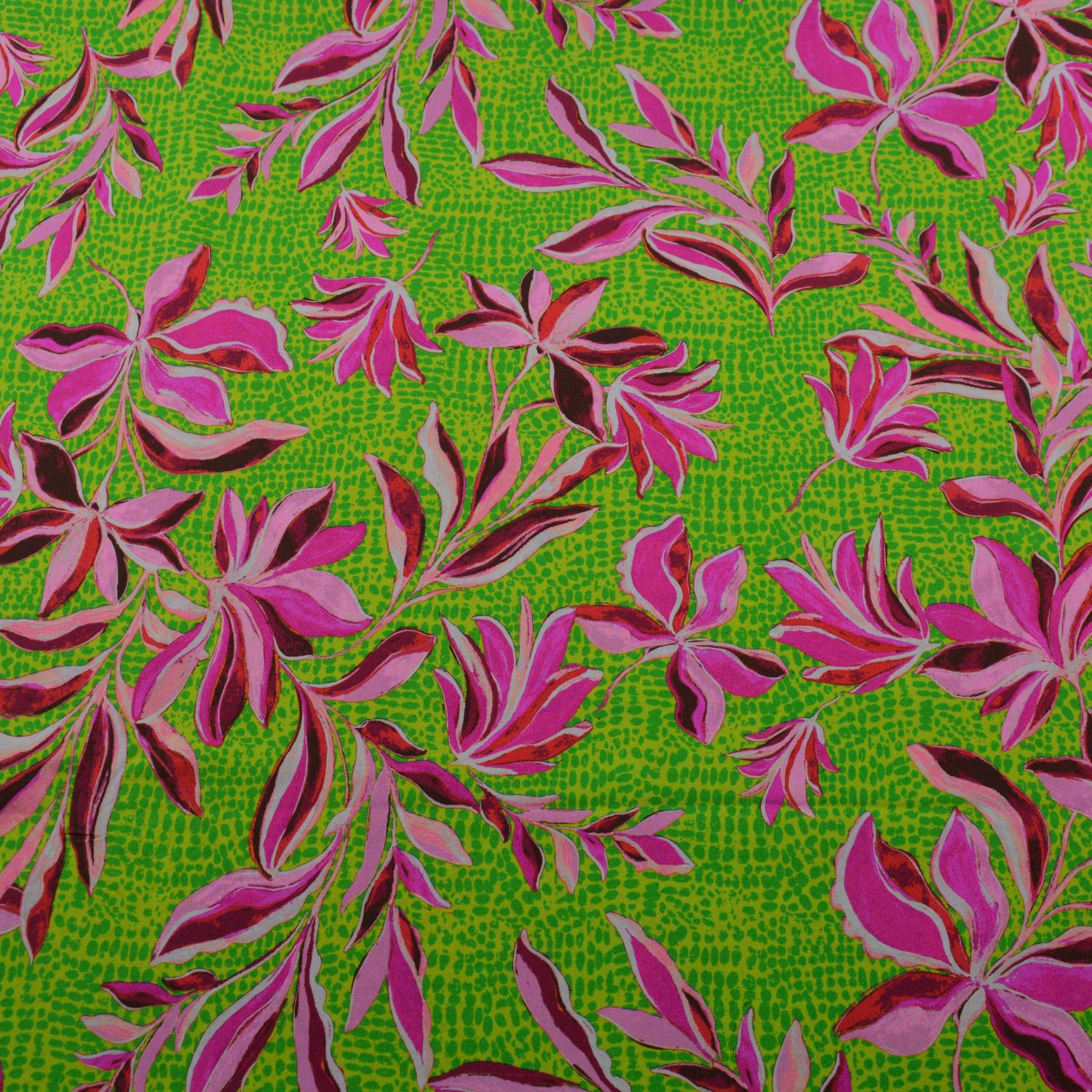 Das Design ist ein echter Hingucker: Leuchtendes Grün bildet die Basis und wird durch ausdrucksstarke florale Elemente in Pink-, Beeren- und Rosétönen ergänzt. Die dynamischen Blätter und Blüten wirken fast tropisch und verleihen dem Stoff eine moderne, energiegeladene Optik. Die Kombination aus intensiven Farben und organischen Formen sorgt für einen trendstarken Look – perfekt für auffällige Mode mit Charakter.