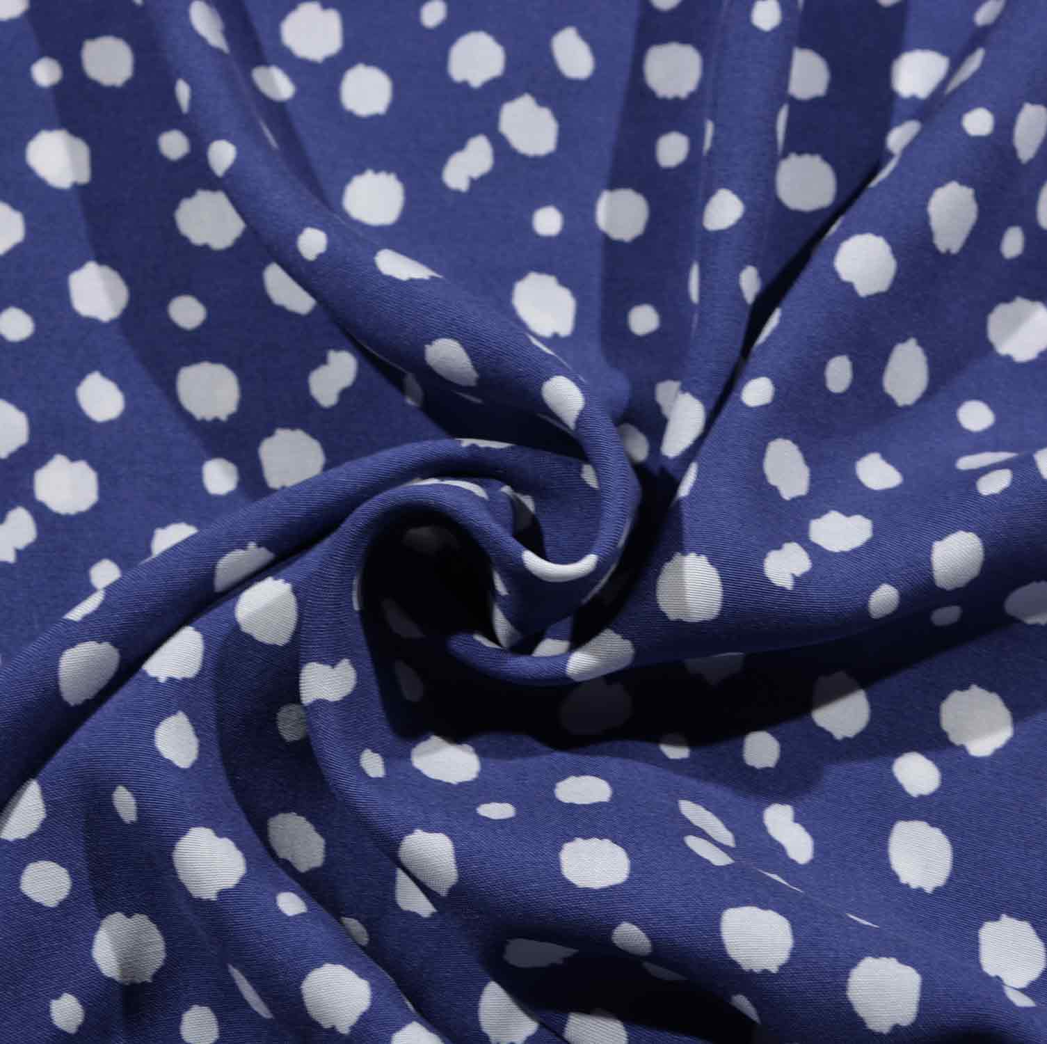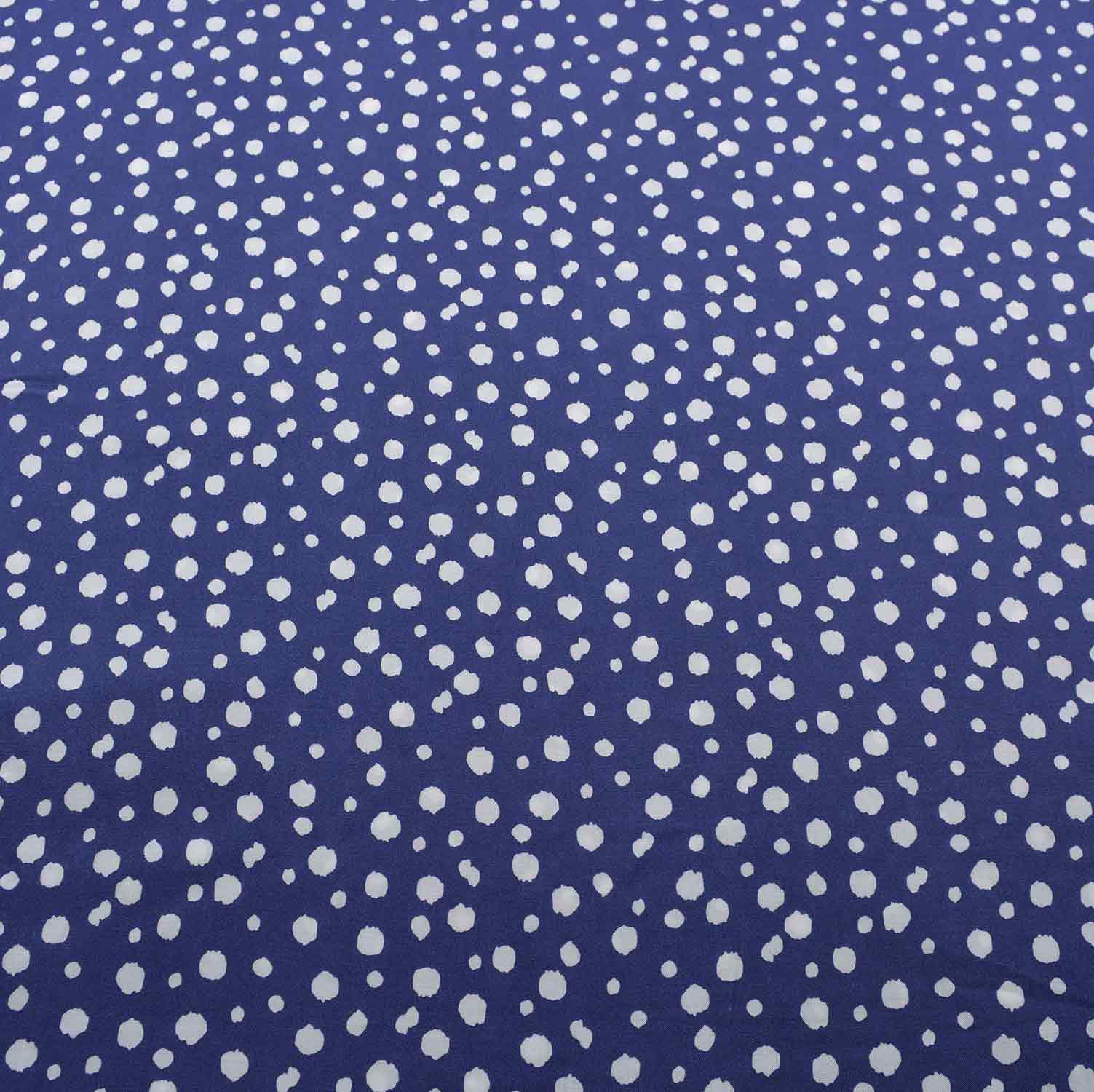 Der Grundton des Gewebes ist ein mildes, dunkles Indigoblau. In unregelmäßigen Abständen sind fröhliche, weiße Tupfen in verschiedenen Größen und unregelmäßigen Formen über den Stoff verteilt und sorgen für eine freundliche Stimmung.
