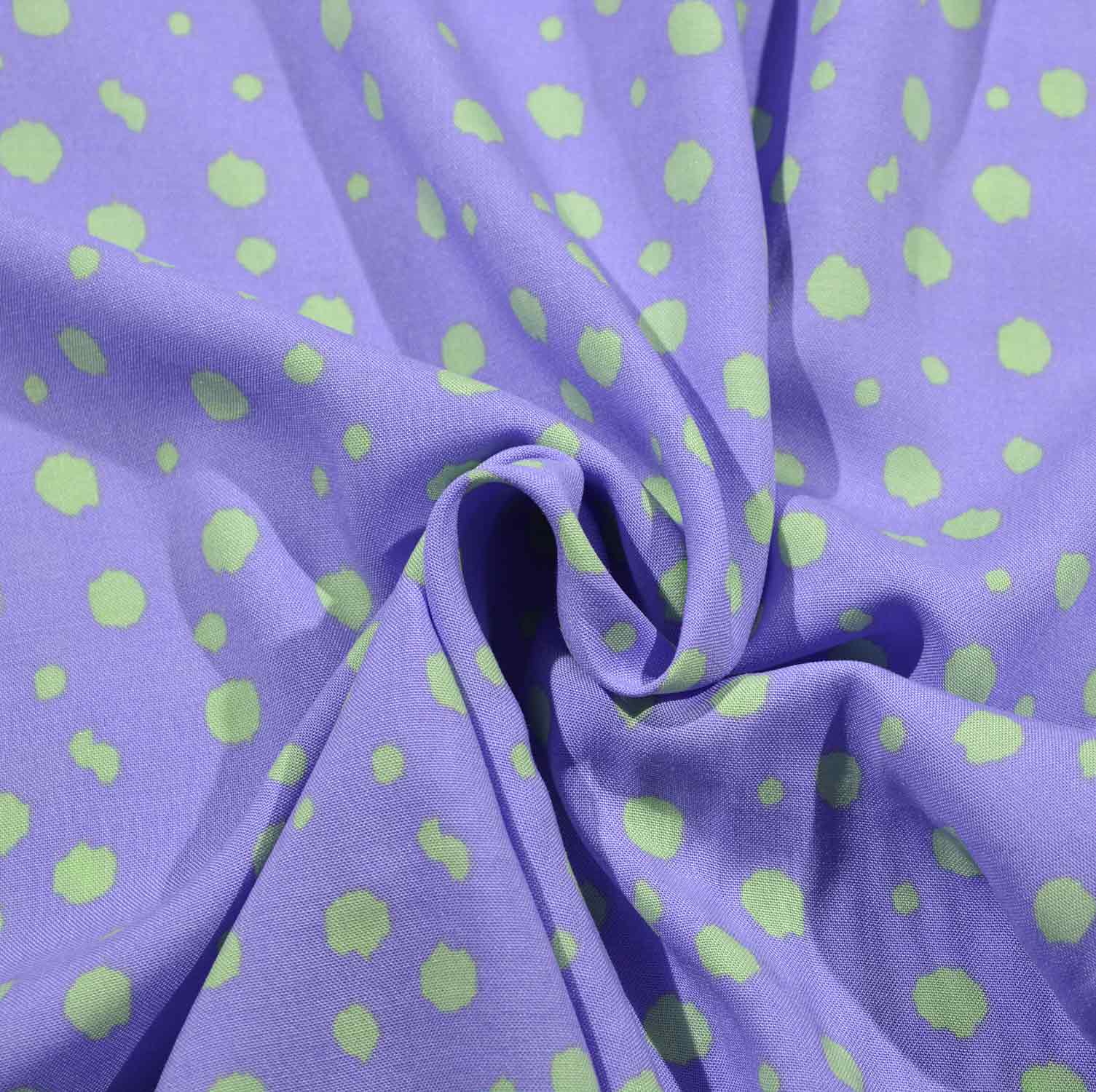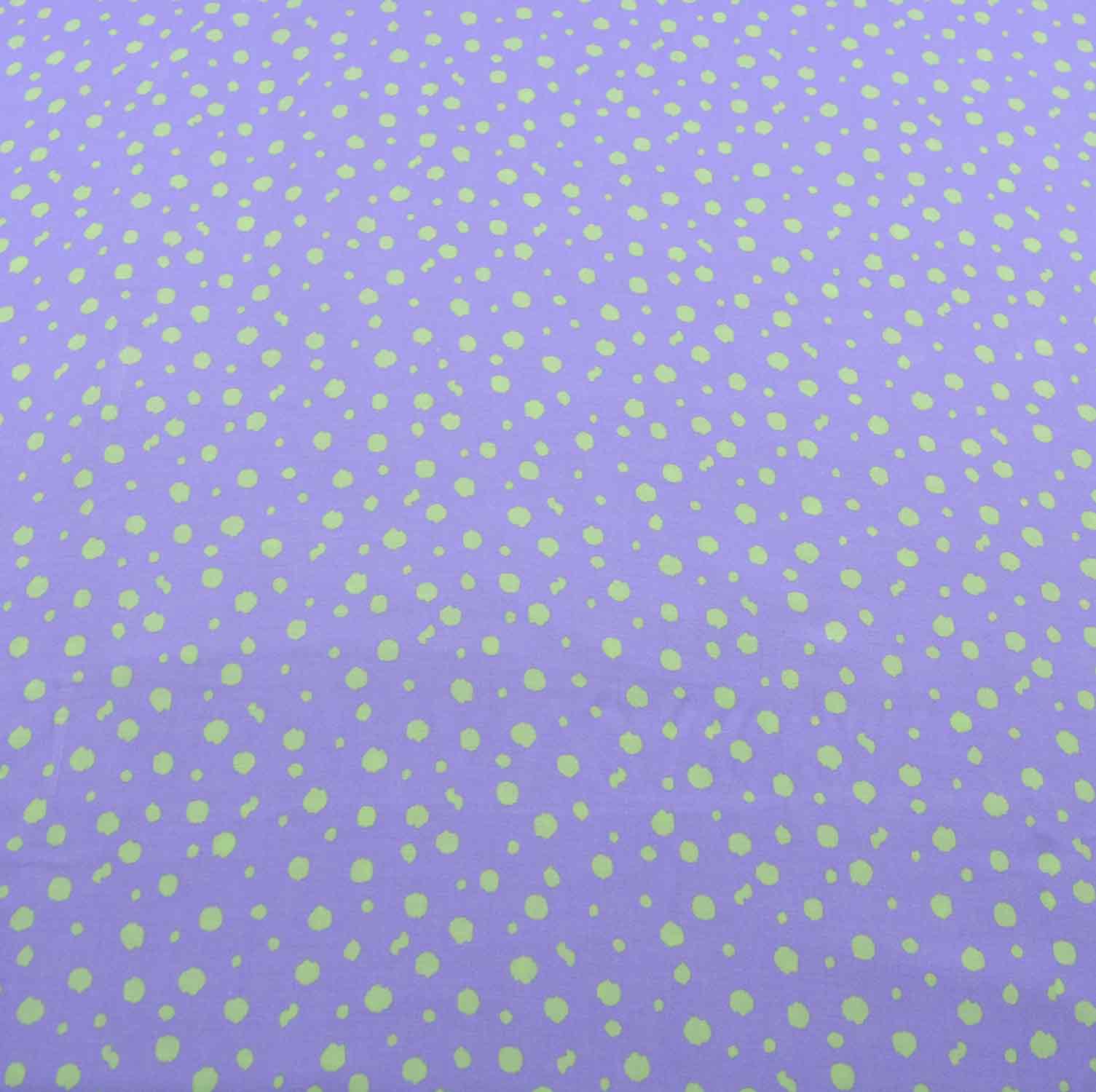 Der Grundton des Gewebes ist ein herrliches, mildes Flieder. In unregelmäßigen Abständen sind fröhliche, mintgrüne Tupfen in verschiedenen Größen und unregelmäßigen Formen über den Stoff verteilt und sorgen für eine freundliche Stimmung.